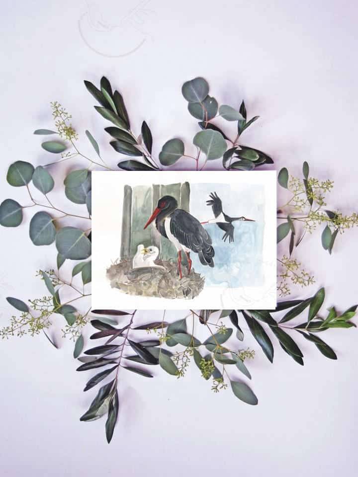 A print featuring black storks (Ciconia nigra). In medieval Europe it was believed that storks not only fed their offspring but also aged parents and in the Far East saw them as a symbol of immortality. Maybe that’s why this bird, in general, is so appreciated …